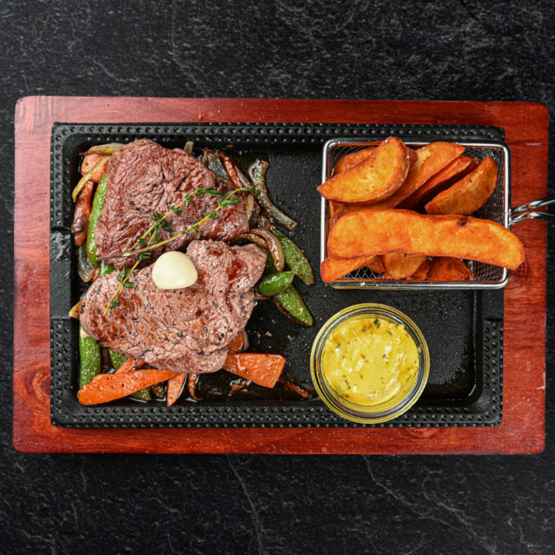 Ca. 200g bøf af oksemørkbrad serveres med kartoffelbåde, gamiture og bearnaisesauce.